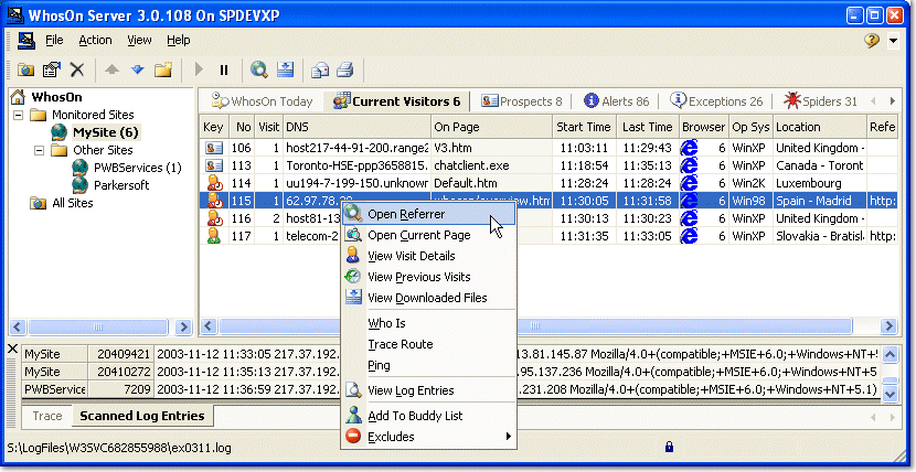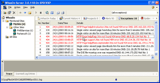 Access log analysis software 'WhosOn' that displays visitors to the site in real time