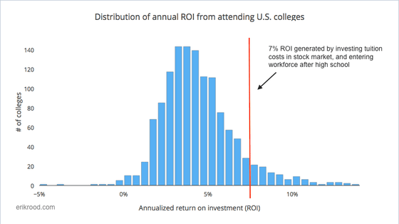 Among the universities listed in Payscale, ROI exceeds 7.1% is about 10%. The bar graph created by Mr. Erik Rood is an array of ROIs for each university, with the place below 5% being the largest mountain. The red line is drawn is 7.1%, which is the ROI when investing money with high school graduates, so if you do not go to the right from here, it means that "ROI was lower for university graduates" .
