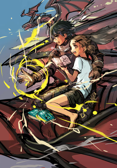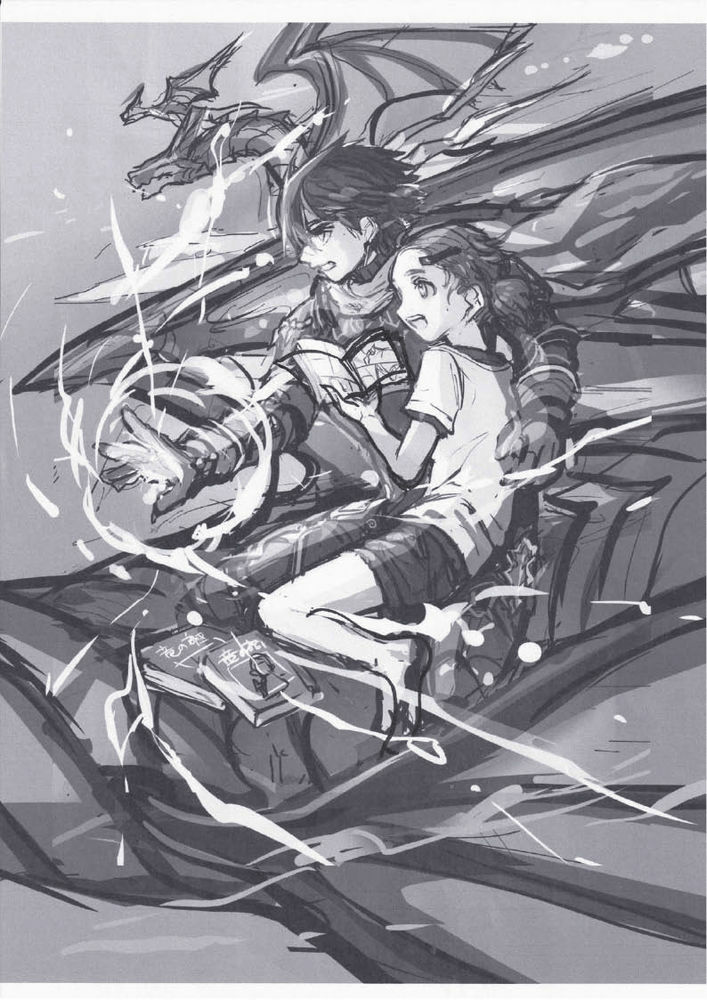 The first rough with a striking contrast between a warrior-like man and a girl in a room. There is a manga book at the girl's hand and knee, and you can understand the concept of 'I entered the fantasy world after reading the manga'.