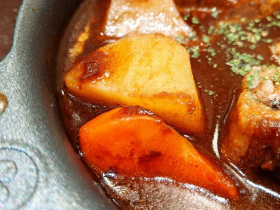 Too good gloss was coming out of the beef, so I thought, “Let's eat beef later” and tried it from potatoes and carrots. The potato remains in the mouth with a moist texture, but the carrots are boiled to the inside and crumble in the mouth. Impression that the original sweetness of the vegetables is pulled out by being simmered slowly. Perfect for a rich stew like red wine.