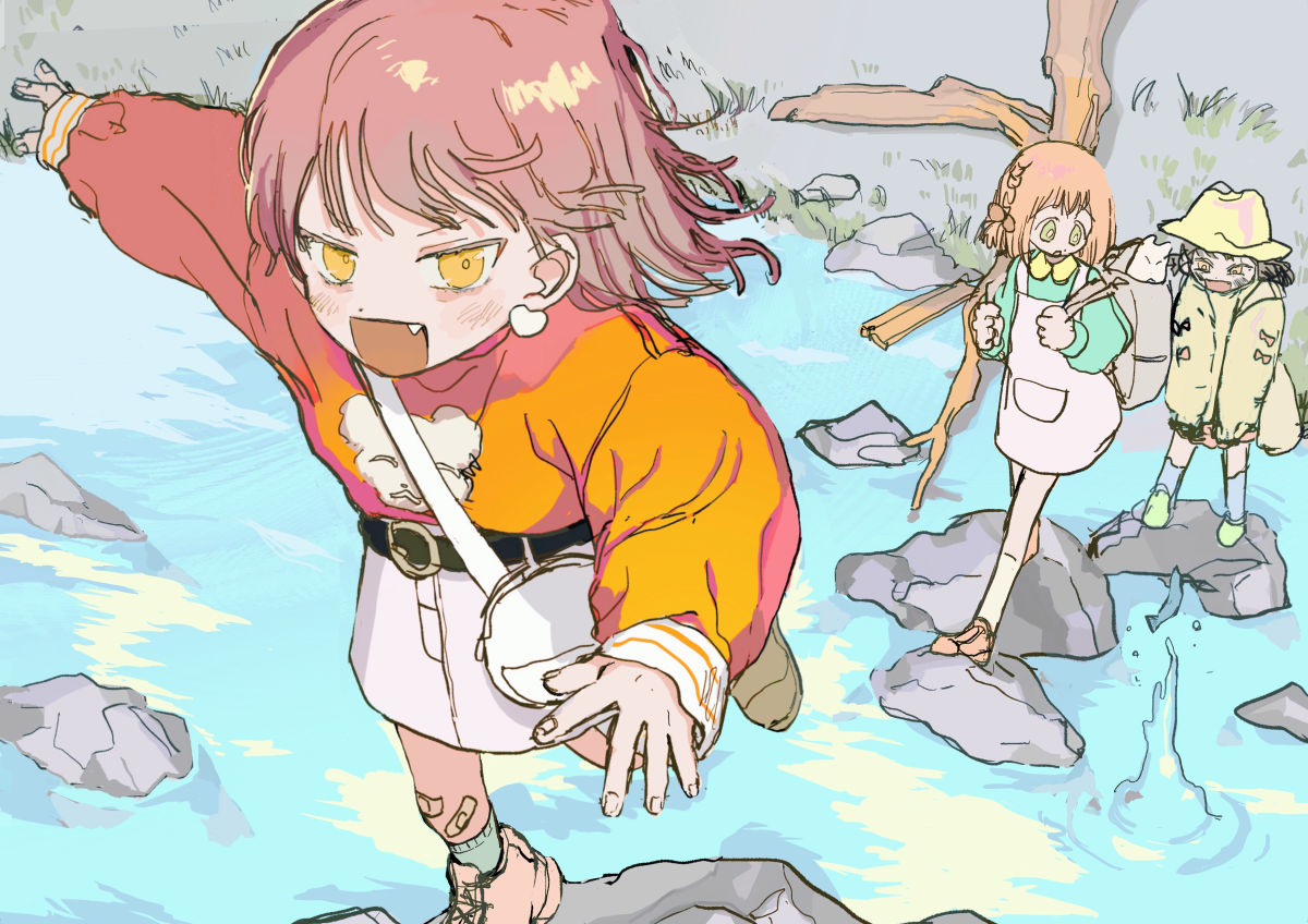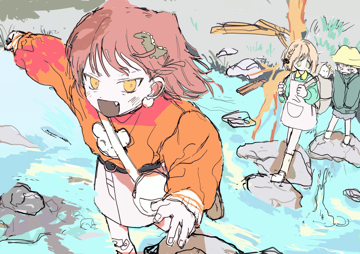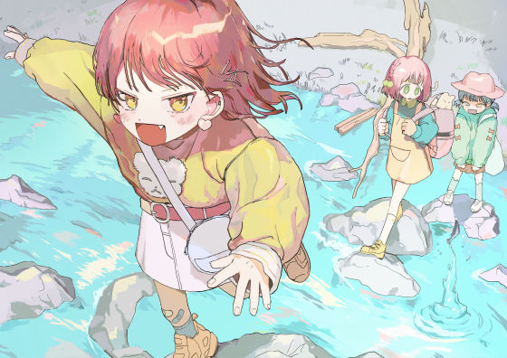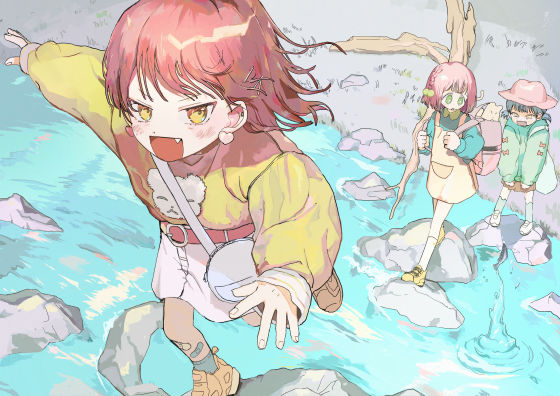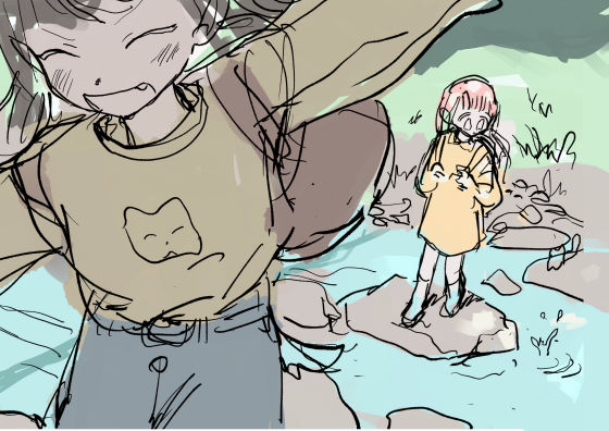 Finally, we asked him to retake his pose by reconfirming the pose of the line of the arm under the oversized jacket and the leg hidden by the skirt. Also, the theme of the illustration is that it will be a very tight illustration if the width of the river is clear, so while bringing the helicopter of the river hidden in the character to the front, the expression of the rock and the perspective of perspective Adjust the feeling.