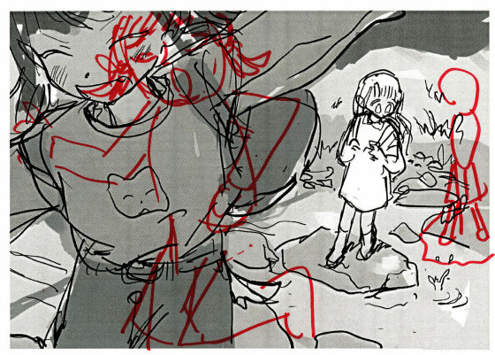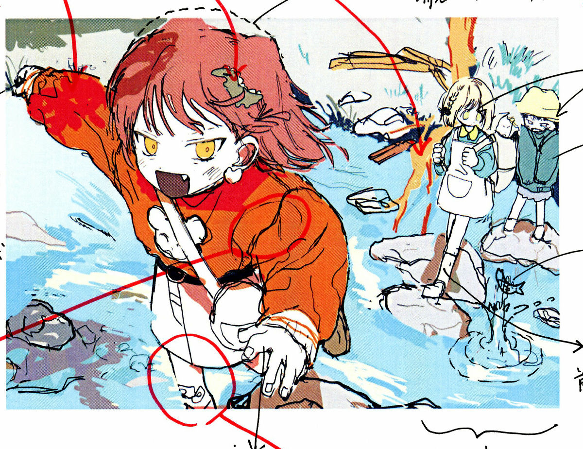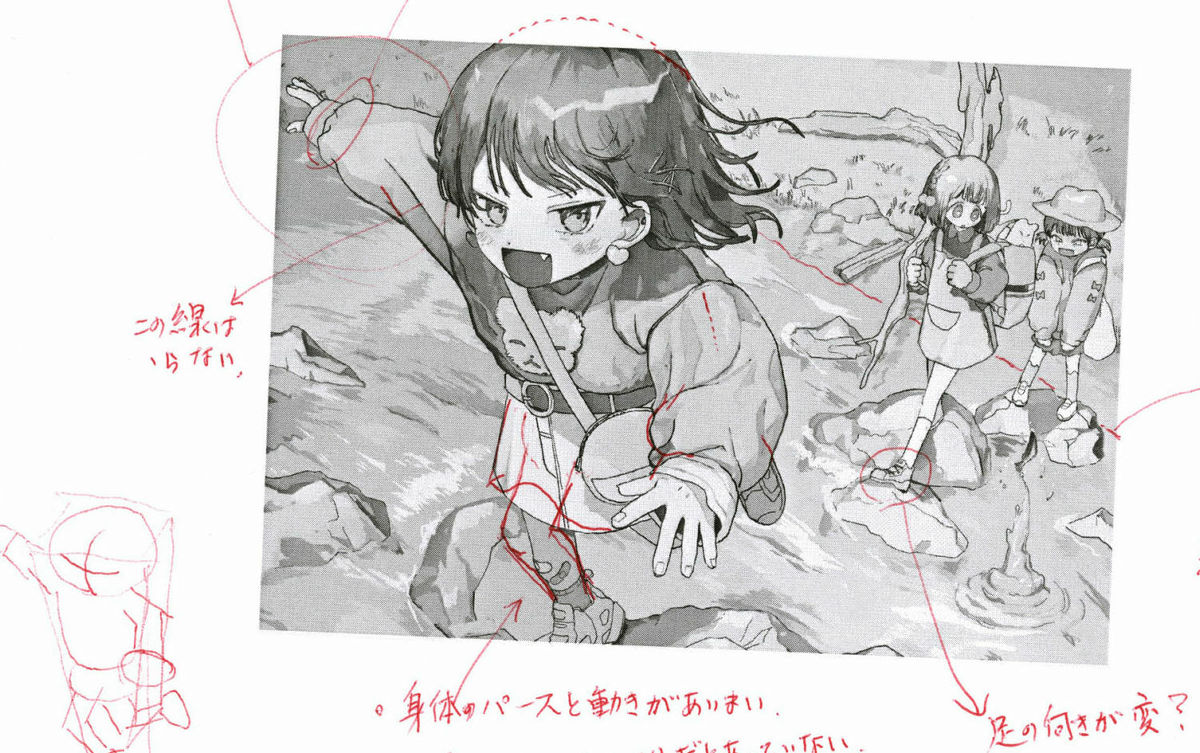 As the features of the top picture, it is assumed that it cannot be seen on a very large screen, so we avoid as much as possible a fun composition packed with elements and elements that are difficult to understand unless you look closely. In this rough, we cut the hairpin, which is likely to be distracting because it comes to the foreground, and the shadow of a tree assuming a stage in the woods, because the one without it gives the overall impression. Also, in order to further increase the dynamism of jumping, a modification has been made so that the right foot that lands on the stepping stone is within the frame even a little. This has to do with the perspective that if you don't draw a foot that has a center of gravity, you will give an unstable impression.