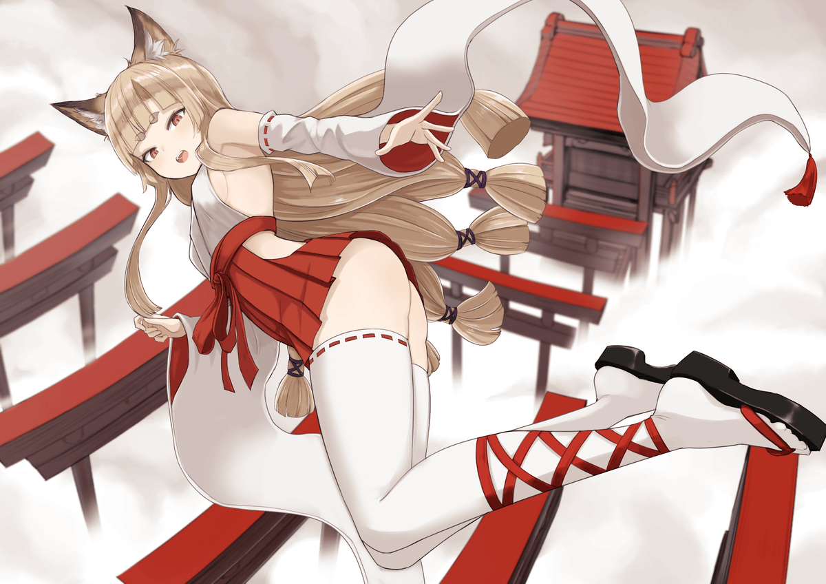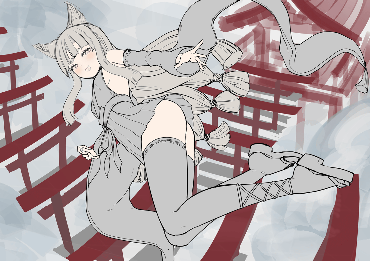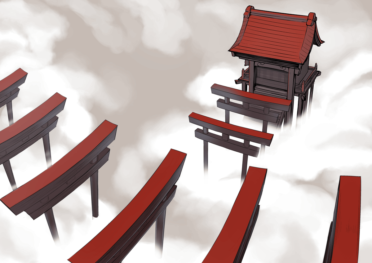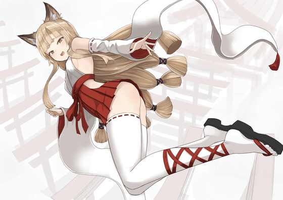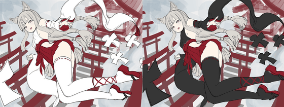 In the more detailed rough, two costumes were proposed: a white costume that I had been thinking about mainly, and a black costume to make the background whiter and differentiating. While adopting the white color that shines in light and dark while matching with similar colors, the red of the costume and the red of the torii in the background also have similar colors, so we confirmed the coloring that uses various `` red '' in shades and shades .