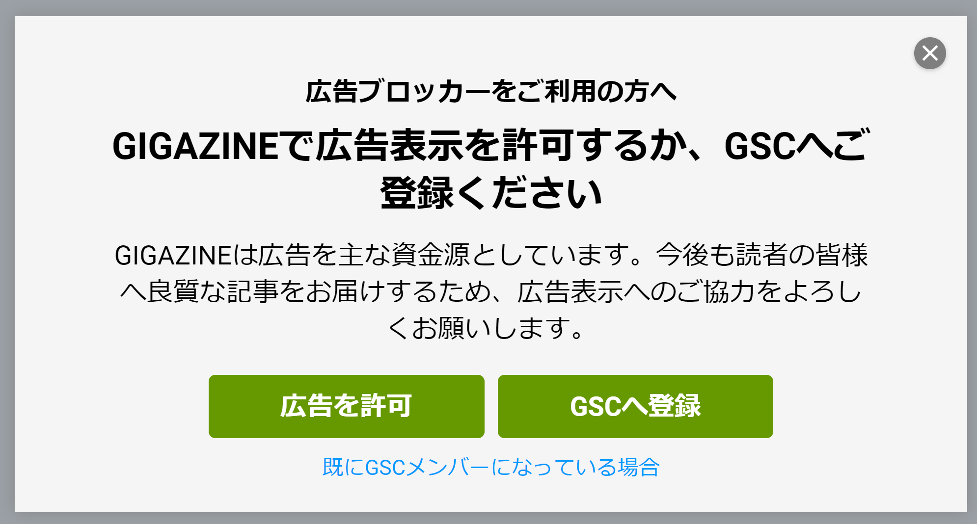 Notice # 2, 'Funding Choices', a tool that collects fees from 'ad blocking users' and returns them to the operator, which was launched in some countries from May 2018, is now available in Japan as well. So I actually enabled it with GIGAZINE. GIGAZINE operates with advertising as its main source of funding. In order to continue GIGAZINE in the future, I would be very grateful if you could cooperate by 'disabled the ad blocker'.