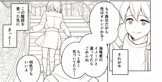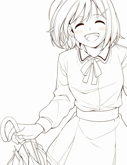 A frontispiece under construction. Nao, who has been drawn in the rain for a long time, is smiling with an umbrella. It seems to be a warm and bright piece that seems to be the final story.