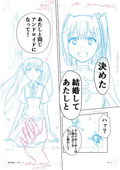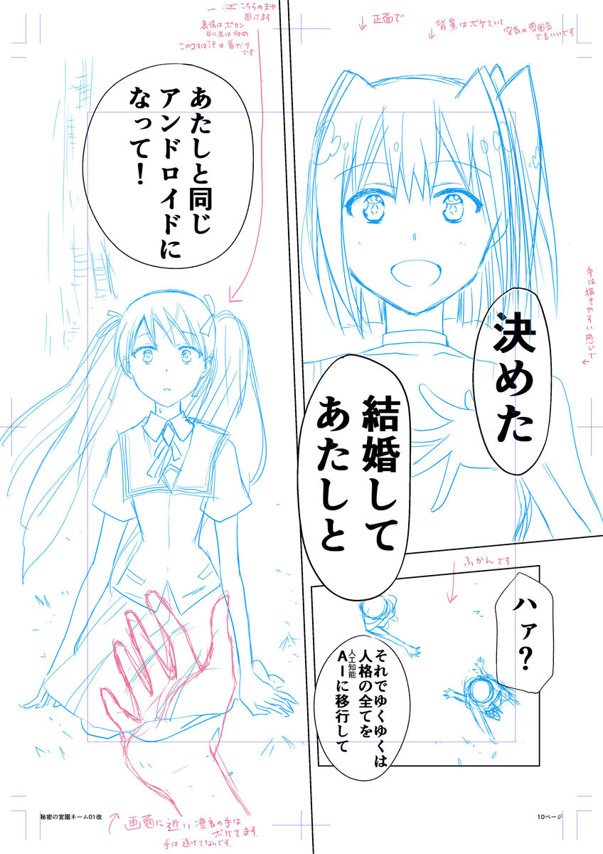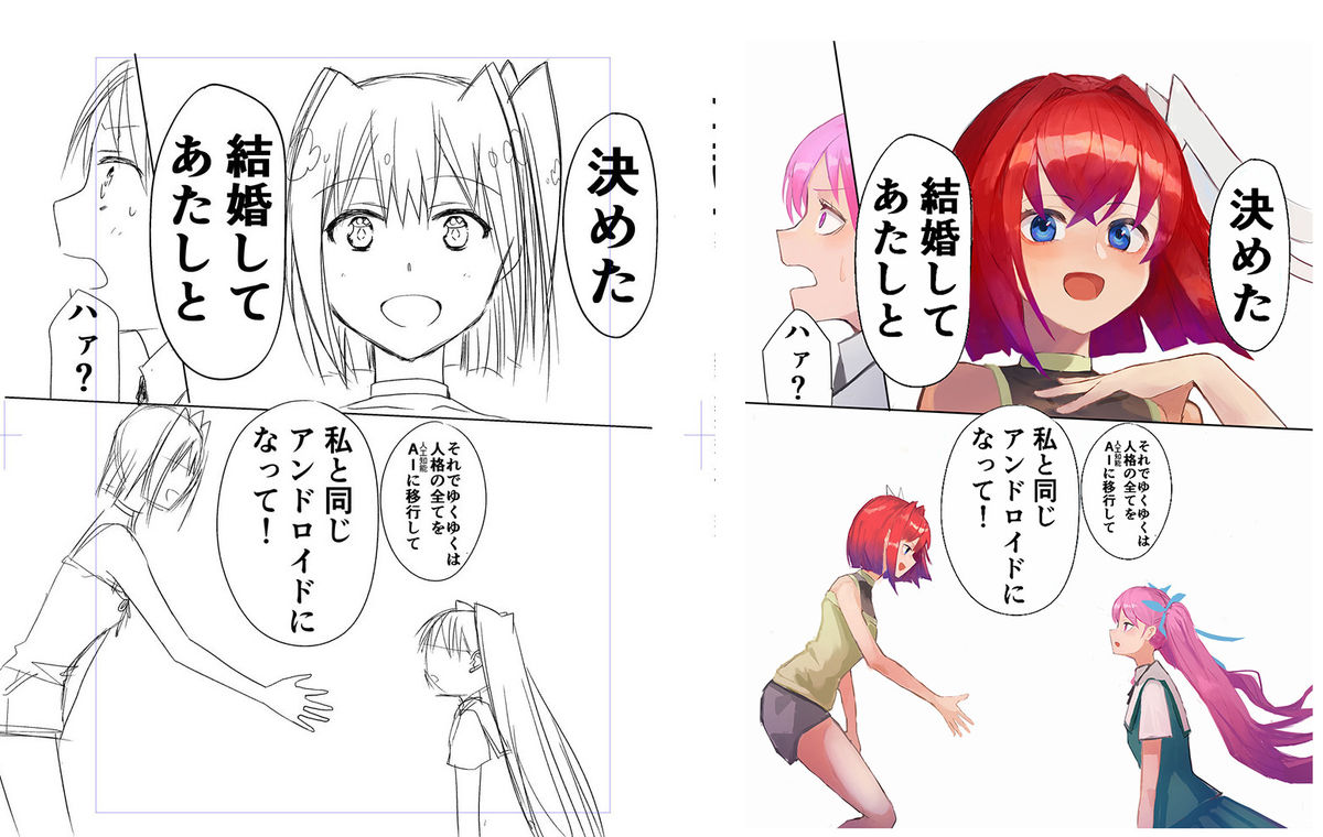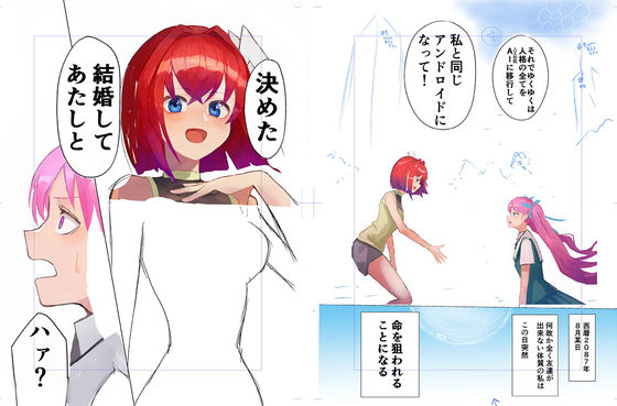 The image is the 'encounter' scene in the middle, the left is the initial name, and the right is the one drawn by the drawing staff as a sample. This SF x Yuri (relationship between girls) is the theme of the work, and it is a waste to see the elements 'android' and 'married to me' on the 5th page ...