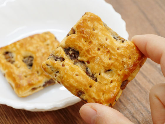 The thickness is less than 1 cm, which is not too big and not too small, but probably because of the large amount of azuki beans, it is sweet as a whole when I try to eat it. The sugar-pickled azuki has a texture similar to that of sweet natto, and the sweetness of honey rushes in with each bite, and in the latter half, the flavors of Western liquor, black honey, and slightly azuki beans are scented. The texture of the all-series unique dough created by 'compressing a dough with a thickness of about 10 cm with plenty of material sandwiched between it with our own technology and spreading it thinly' remains the same, but the gentle sweetness of the condensed milk used in the dough and the gentle sweetness of the condensed milk. I enjoyed the balance between the sweet azuki beans and the crisp taste. There are two in each pouch, so it's also the best amount when you want to eat something sweet.