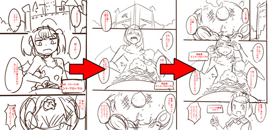 Also, the following page seems to be close to the time of serialization and has changed significantly. In the serialized version, the punch line where mint becomes a child is drawn at the end of one episode, but in the initial plan, it was a child figure from the beginning. This was changed as the pictorially interesting point of 'changing appearance' should be shown in one episode. In addition, the initial plan that the third frame is only ramen and the maid appears on the next page has been changed to show the maid in the serialized version because it is a waste that the special character does not appear first.