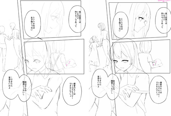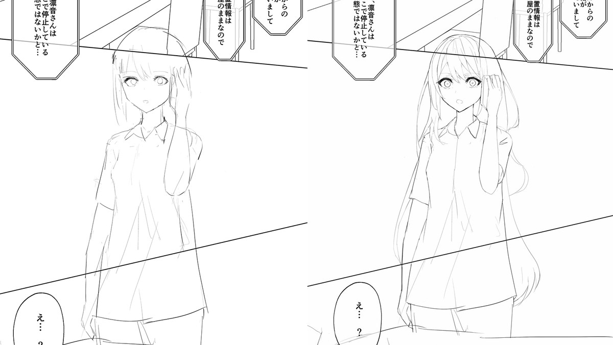 On the following pages, only the rough rough lines have been arranged, but both the Rinne in the first frame and the Hanane in the third frame have expressions that include slightly complicated emotions, so that it can be expressed well. Adjusted to.