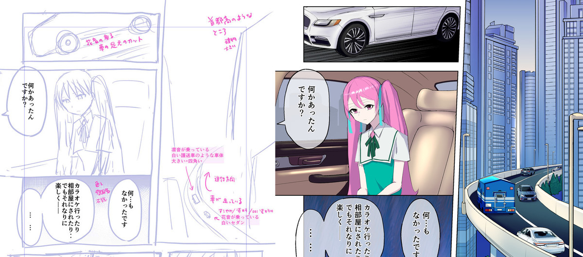 In the second part of the third episode, the stage goes out of the school and the dormitory, so there was a part that portrayed the stage change firmly. On the following pages, Help draws on the highways and buildings where the car with the flower sound runs, and the outside and inside of the car with the flower sound.