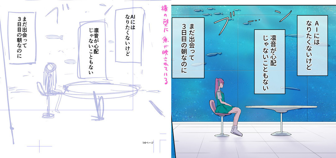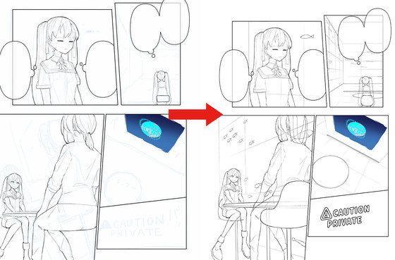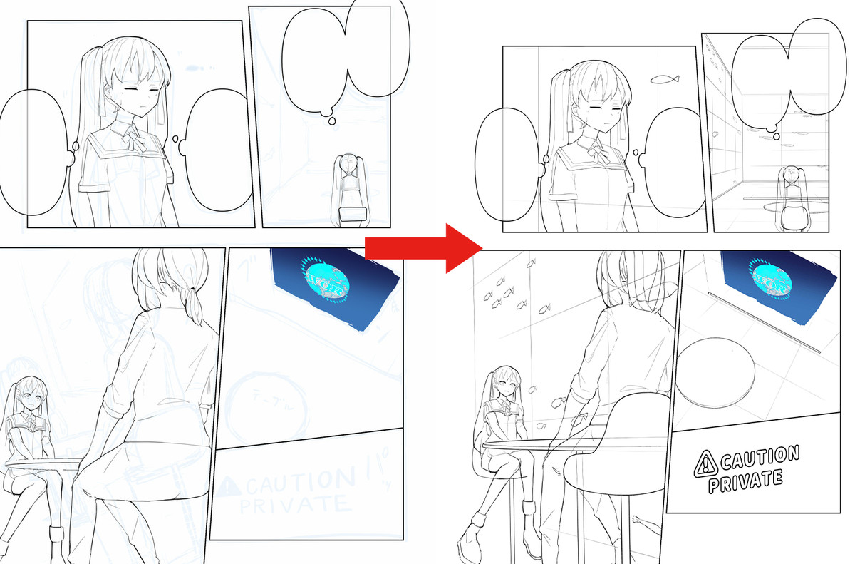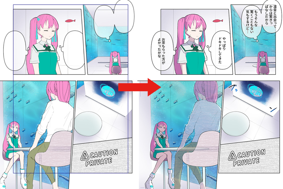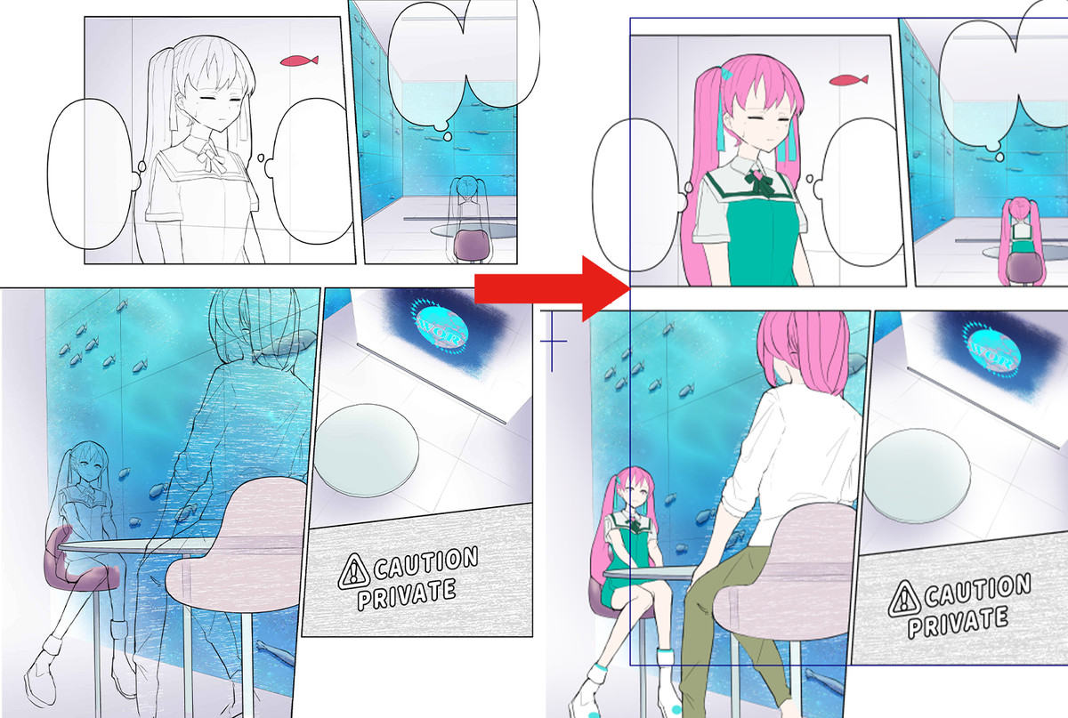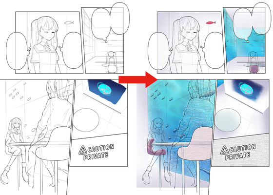 Finally, the person in charge of drawing performs shadow and light processing to fuse the background and the character, and other detailed final processing to complete. On the following pages, the painting of the flower sound in the second frame has changed, and the fact that the person in the stereoscopic image in the fifth frame is transparent is an easy-to-understand change.