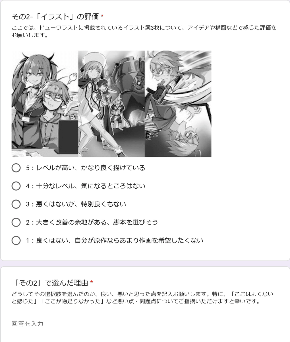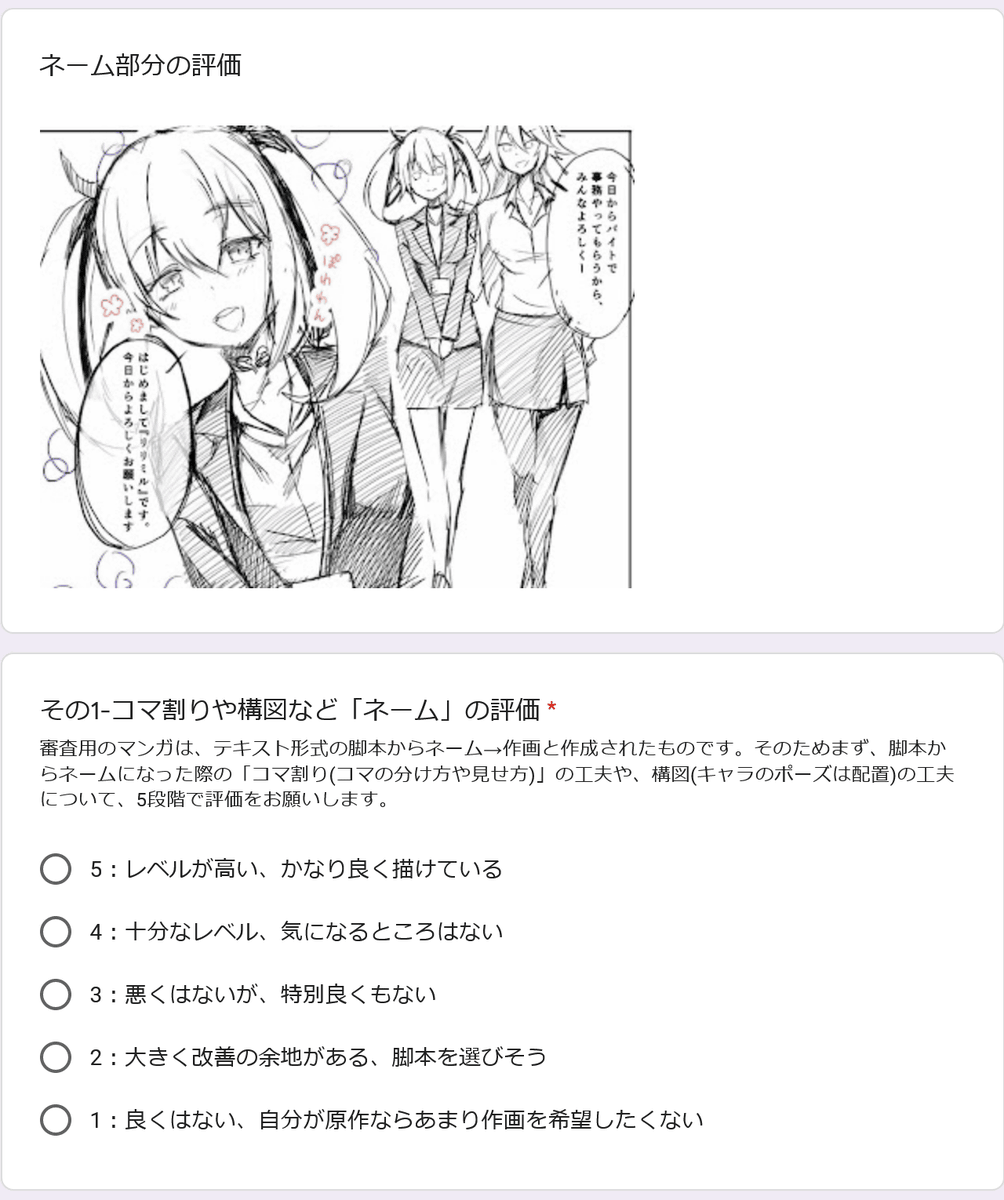 Please evaluate the drawing with two points, 'name / frame division' and 'illustration'. First of all, the ingenuity and drawing method that have become the name from the script in text format are evaluated on a 5-point scale.