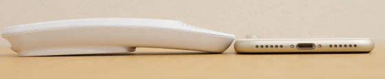 The left is the REON POCKET 3 main unit, and the right is the iPhone SE (3rd generation) for size comparison. The height is about 2 cm. From the side, you can see that the design is slightly curved.