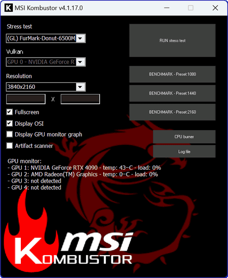 I ran a stress test for 10 minutes on ``FurMark-Donut-6500M (GL)'' of MSI's burn-in benchmark tool ``MSI Kombustor'' on a full screen with a resolution of 3840 x 2160 pixels.