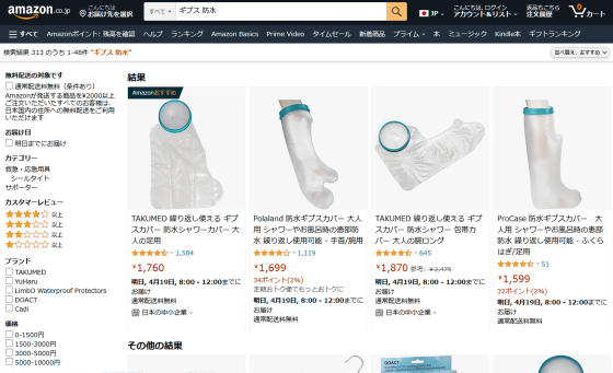 According to the nurse, 'If you search on the internet, you will find useful waterproof goods.' Therefore, as a result of searching for the word 'gypsum waterproof' on Amazon.co.jp, the waterproof cover was displayed as follows. This time, I wanted a waterproof cover that covers the forearm, so I bought a Polarland waterproof cover that covers the forearm .