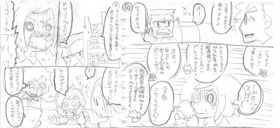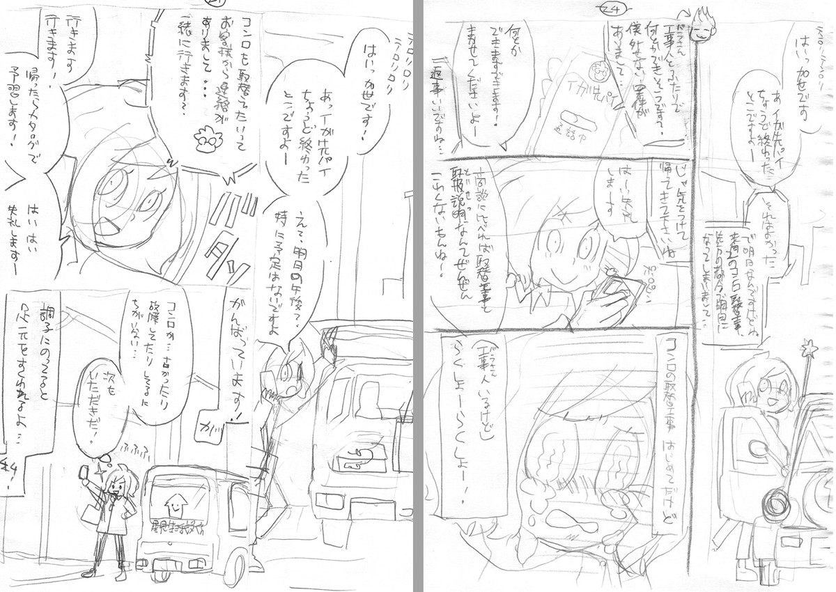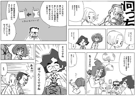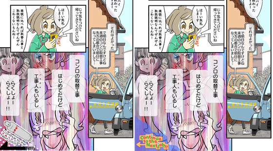 The revised manuscript that was created as a 'punch line that worries me about the continuation' is 'After the completion of the witnessing of the gas installation work after the contract, the next job request comes in on the way home.' On the left of the image below, Kyu, who is in high spirits due to the success of the contract, is overlaid with a narration that says, 'If you're on top of things, you'll be caught off guard... me!' Plan B on the right side of the image depicts “Kyu’s big failure” in episode 2, so while the monologue is optimistic, the crying face of Kyu depicted in episode 2 is included as a picture.