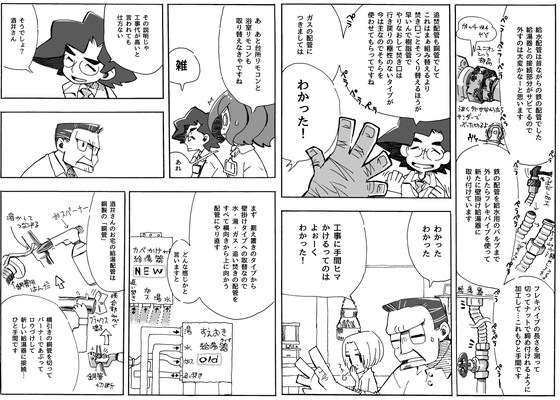 In order to avoid the impression that Iga-senpai is treating the customer while demonstrating his competence, the exchange has been changed so that the customer asks questions and Iga-senpai responds accurately. Since 'Gasya de~su!!' is intended to 'want people to know more about gas', it is easier for readers to understand by using a Q&A format rather than a one-sided question. In addition, by making it a flow of “Iga-senpai takes over the explanation role from Kyu who hastily stuffed sweets in her throat”, it is not just arranging explanations in the explanation scene, but even a little by incorporating Kyu’s reaction. The author's ingenuity is added to make it an interesting picture.
