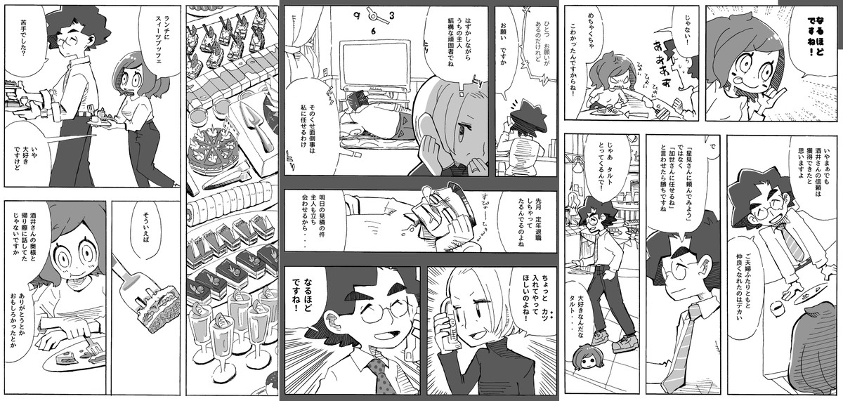 The original punchline was a good development as a one-episode conclusion, but in order to make the story continue in the serialized version, it was decided to introduce the 'company friends' who will be dating in the future. Due to the skill of the author, the personalities and relationships of each character are well presented in two pages.