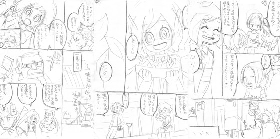 Another point related to the first page, about the composition of inserting a 'door picture' at the beginning. In the illustration on the left of the first image below, Kyu's feet are cut off at the edge of the screen. When drawing a single picture, there is an idea that it is easier to feel the character is more attractive if the whole body is included, or that if only a part of the body is cut off at the edge of the screen, the composition will look broken. Therefore, a door painting plan like the one on the right in the image below was created. In the end, it was decided to proceed with the story without inserting the frontispiece, but this new frontispiece plan will be used as an announcement illustration that will be released at a later date.
