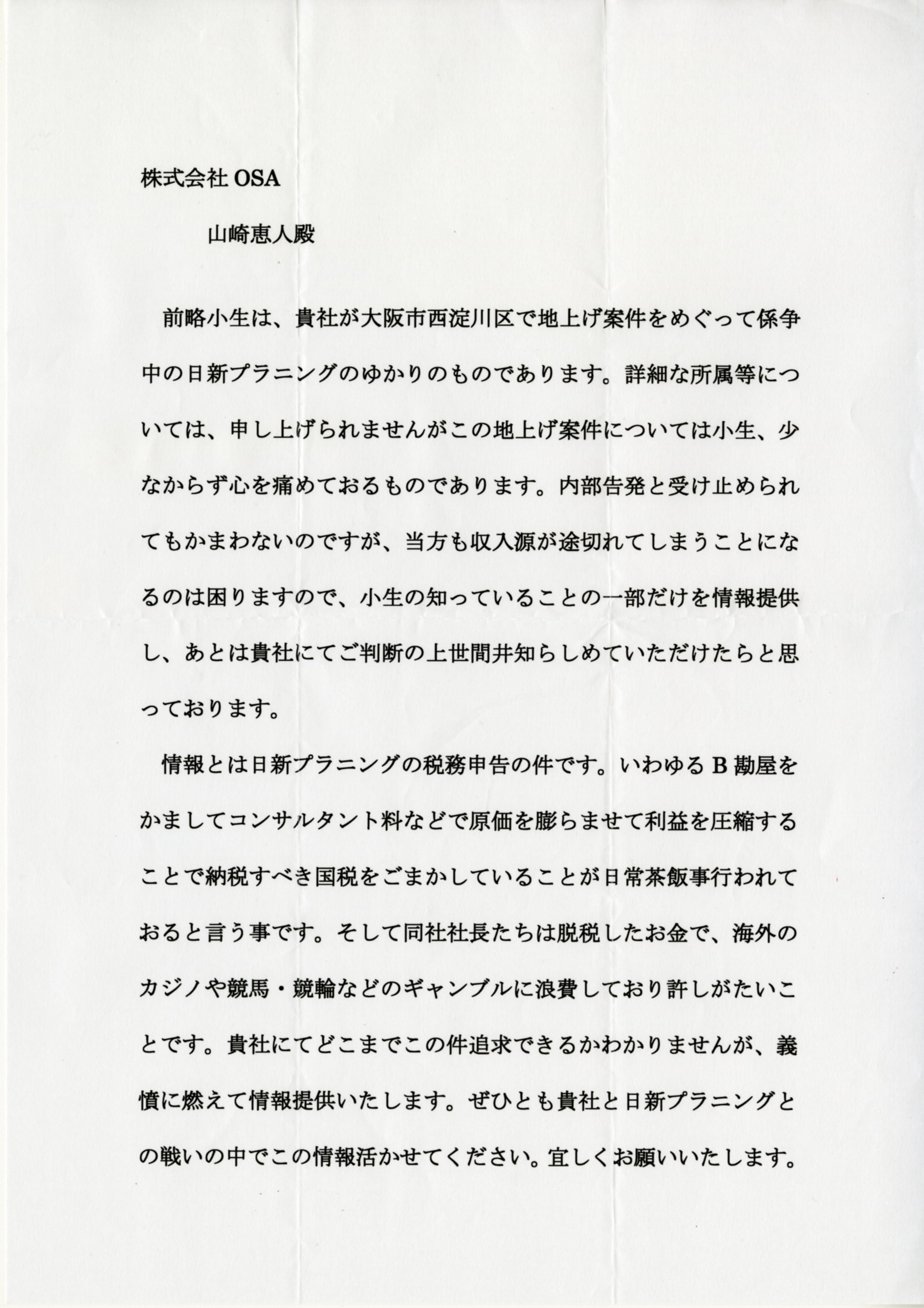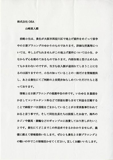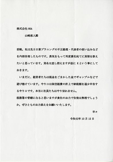 And on December 18, 2019 (Wednesday), two accusation letters arrived to Mr. T, who was in charge of the two corporate divisions of the West Tax Office, and then various survey results documents researched by GIGAZINE, and sent from many other GIGAZINE readers. The general flow is that GIGAZINE submitted all related materials together with other information about Nisshin Planning that has been received.