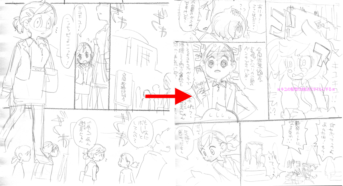 At the end of episode 6, time suddenly returns to the past and the story directly connects to episode 7, so there are two points to consider: ``Will the story be conveyed smoothly from the previous page?'' ``Will it be conveyed smoothly to the next episode?'' It was considered. First of all, regarding the part ``Will the story be conveyed smoothly from the previous page?'' Even if there is a scene change, it may be difficult to understand that ``we have returned to the past,'' so a friend wakes up Kiyu who was dozing off. By telling them that the company briefing session has ended, we make it easier to understand when the current time is. Also, by including Kiyu waking up after Kiyu falls asleep and reminisces, the flow of the story is made easier to understand.