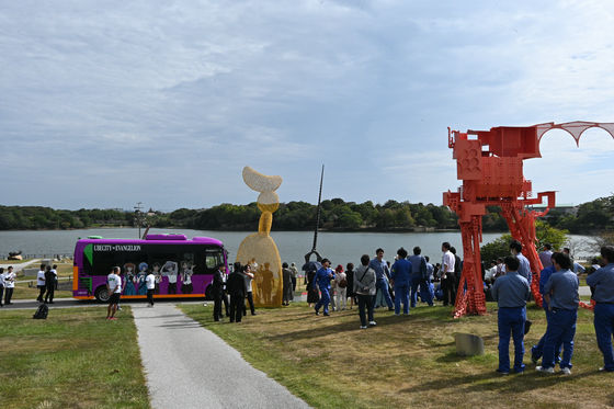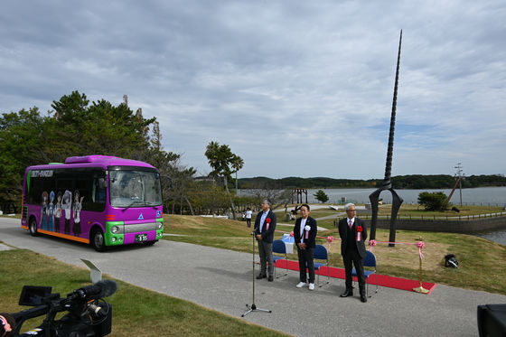 Yasuhiro Kamimura, president of Groundworks Co., Ltd., which is in charge of copyright management of 'Eva,' Ube Mayor Keiji Shinozaki, and Ube Steel President Hisao Yamane were present.