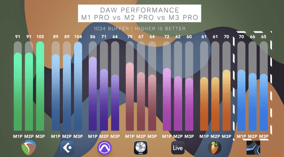 Therefore, it was found that the performance performance of M3 Pro, which has a higher number of cores than M1 Pro and M2 Pro, was superior in REAPER, Cubase, and FL Studio. On the other hand, it has been reported that the M1 Pro's performance results are better than the M2 Pro and M3 Pro in Pro Tools, Logic Pro, Ableton Live, and Studio One.