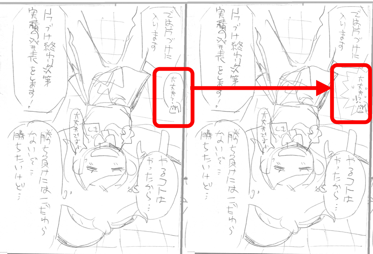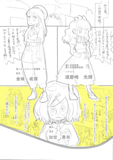 As a result, the first page has been changed as follows. It's the same as looking back at the achievements of the first day of the event, but by focusing on the two characters who will be Kiyu's rivals in close-up instead of a digest of the developments, I imagine it would feel natural even if you continue reading from episode 10. It also clearly depicts Kiyu standing up against powerful rivals with a strong will, and this structure continues into the final episode, episode 12.