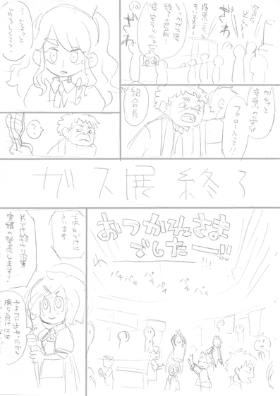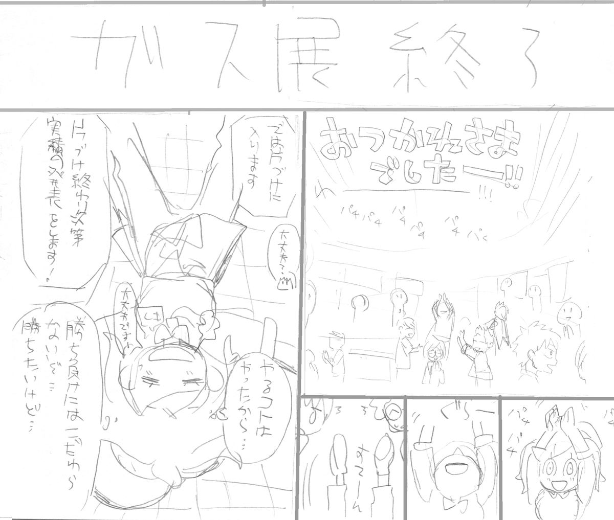Another point I focused on was the following page. The event ``Gas Exhibition'' is a word that has been appearing since the middle of the work, and it was a fairly big job and a goal event for the newcomer Kiyu. However, the page below seems a little plain for a scene where a 'big event has been completed'.