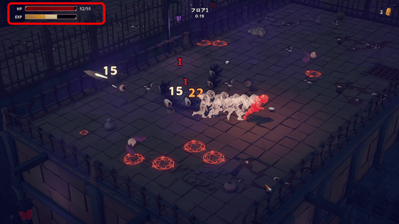 First, the battle begins on 'Floor 1'. The only operations the player can do are move the character up/down/left/right and dash with the space bar. Attacks are automatic. You can clear the game by keeping the enemies that keep spawning in the narrow space alive for a set amount of time on each floor.