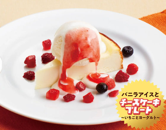 'Vanilla ice cream and cheesecake plate - strawberry and yogurt' (438 yen including tax)