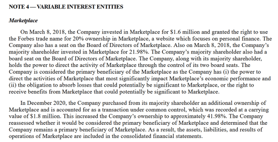 While investigating the details of Forbes Marketplace, Lofgren discovered the name Forbes Marketplace in a document about stock transactions for Forbes filed with the U.S. Securities and Exchange Commission. The document included information such as 'Forbes has granted Forbes Marketplace the right to use the trademark,' 'Forbes owns 39.53% of Forbes Marketplace's stock,' and 'Forbes has one seat on the board of directors of Forbes Marketplace, and Forbes' largest shareholder also has one seat.'