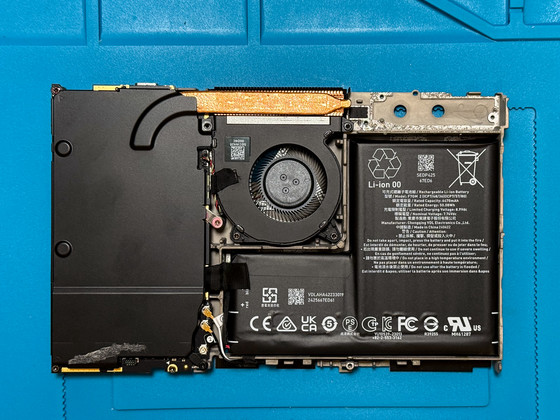 With the display and controller removed, the motherboard and battery pack fit into the miniaturized internal frame, which looks like this.