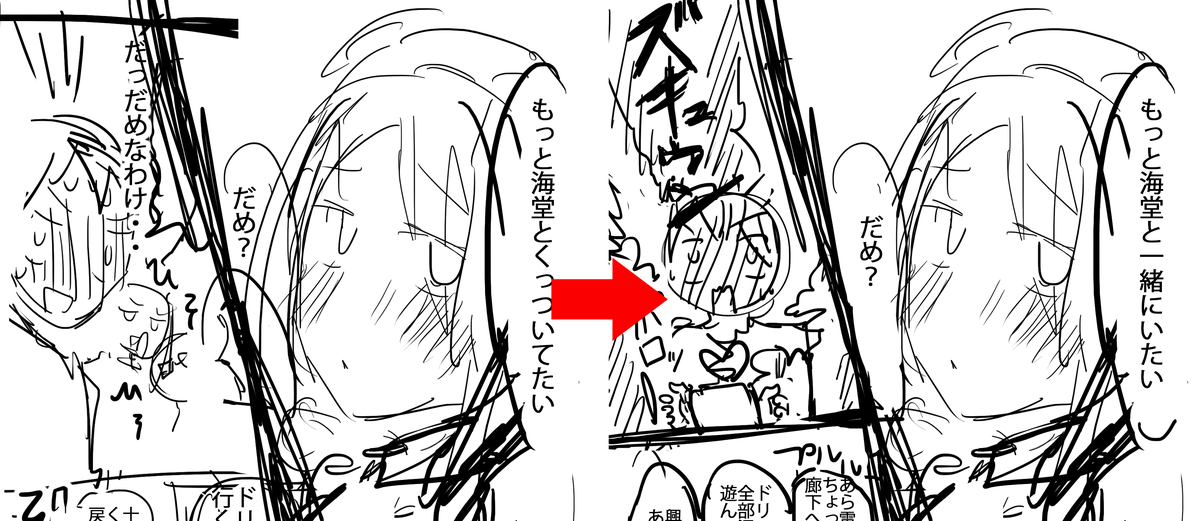Another big change was the karaoke scene where Kaidou and Eshima are alone. Before the edit (left), Kaidou was singing to liven up the mood, but after the edit (right), Eshima monopolizes the microphone, and Kaidou watches and enjoys it.