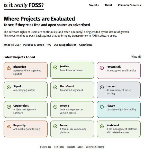 When you access 'Is it really foss?', the names of FOSS are listed in the order they were newly added, and each classification is displayed with an icon and color.