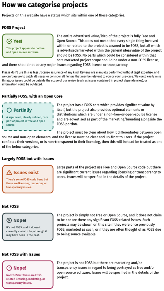 The classification is shown in five categories: 'Yes!' (FOSS), 'Partially!' (open core and partially FOSS), 'Issues exist!' (mainly FOSS but issues exist), and two types of 'Nope!' (not FOSS/not FOSS but FOSS-related licensing issues exist).