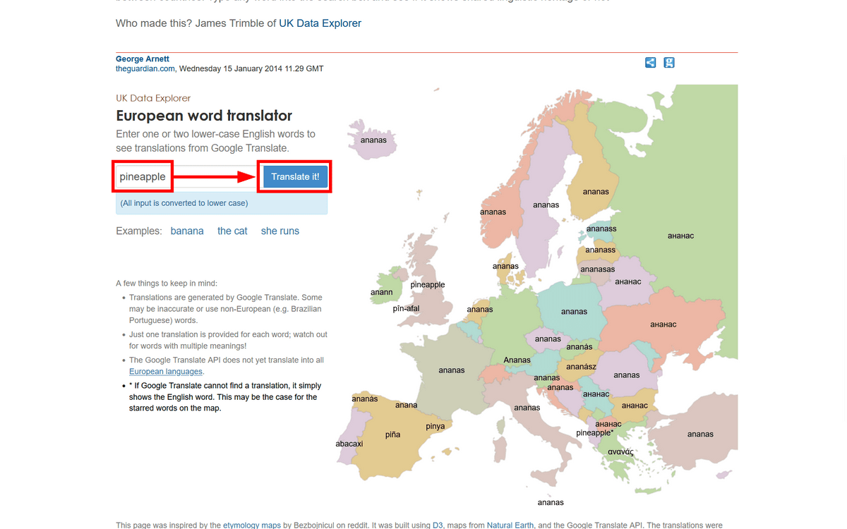 Hover your cursor over a word on the map to see the language it is in. This is useful for researching things like where 'pineapple' is called 'ananas.'