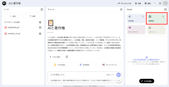 For example, the following shows the results of loading ' (PDF file) AI and Copyright ' and ' (PDF file) AI Utilization Guidelines: Practical Reference for AI Utilization, ' both published by the Copyright Division of the Ministry of Internal Affairs and Communications' Agency for Cultural Affairs, into NotebookLM. The 'Chat' section in the center contains a summary of the loaded document.