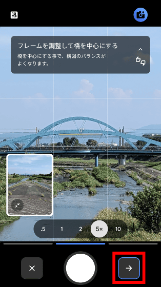The message 'Zoom in on the bridge' appears at the top of the screen, and the zoom magnification selection button at the bottom is highlighted in blue. Change the zoom magnification to 5x and tap '→' at the bottom right of the screen.