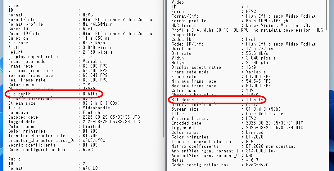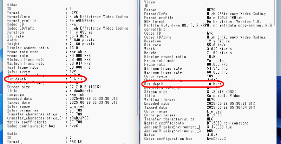 As mentioned above, HDR is disabled when shooting 4K 60fps video on the Pixel 10 series. Below are the results of checking videos shot on the Pixel 10 and iPhone 16 Pro using MediaInfo , which allows you to check detailed video information. We can see that the Pixel 10 records in an 8-bit color space, while the iPhone 16 Pro records in 10-bit.