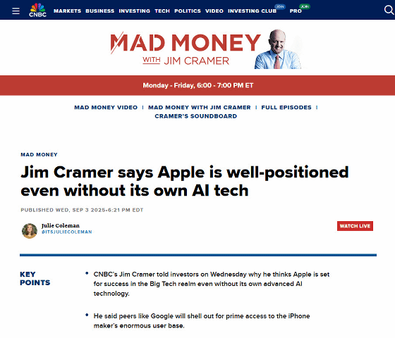 https://www.cnbc.com/2025/09/03/jim-cramer-apple-is-well-positioned-without-ai-tech.html