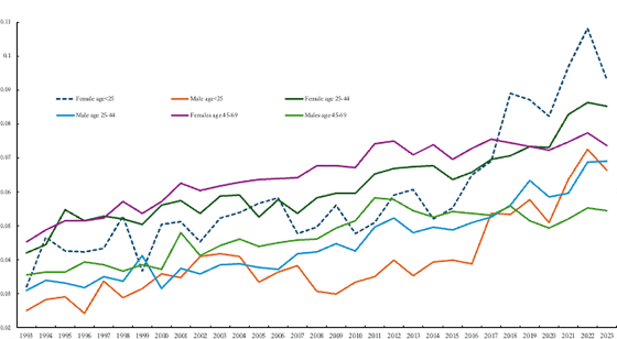 Despair also increased significantly among middle-aged people (ages 25-44), but at a slower rate: from 4.2% to 8.4% for women and from 3.1% to 6.9% for men. For those aged 45-69, the increase in despair between 1993 and 2024 was smaller.
