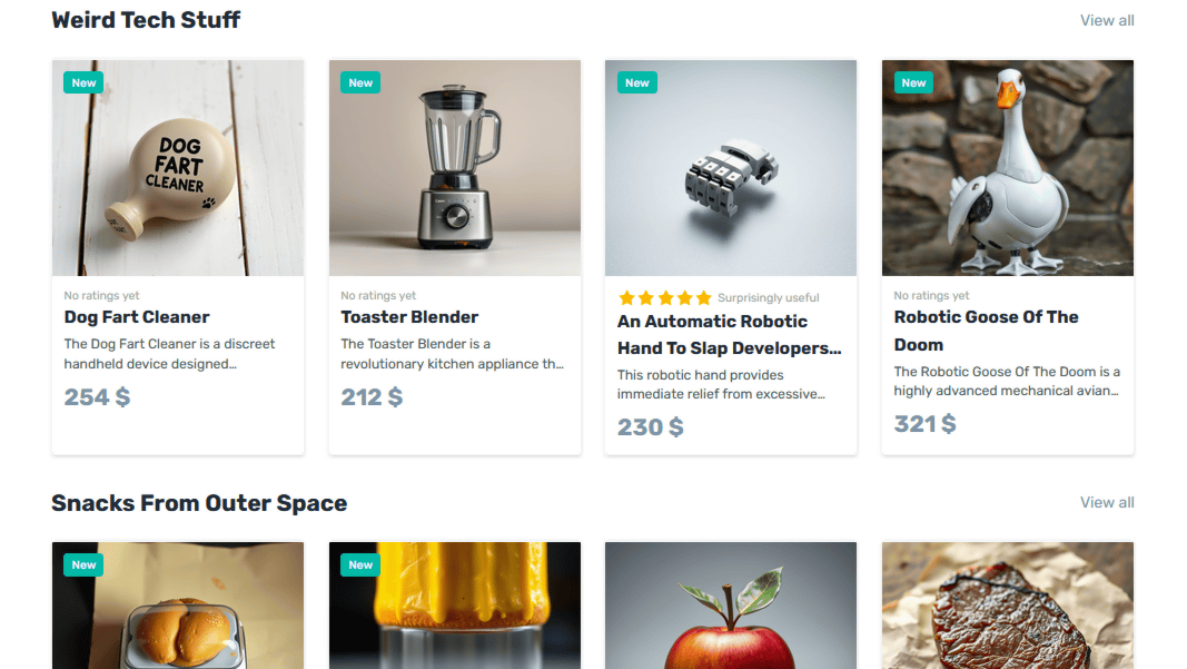 Scrolling down, strange products such as 'Dog Fart Cleaner', 'Toaster Blender', 'An Automatic Robotic Hand To Slap Developers Head When They Over Do Object Oriented Programming', and 'Robotic Goose Of The Doom' were displayed.