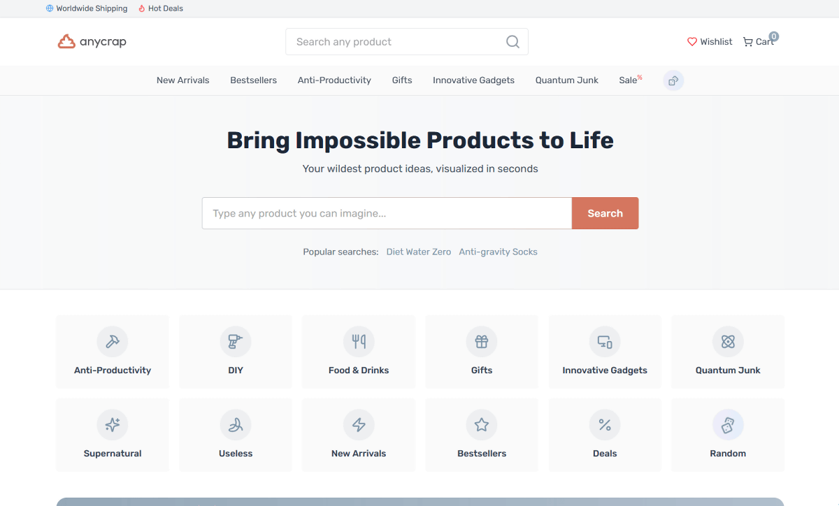 Anycrap's homepage looks something like this. There's a search form at the top, as well as product categories like 'Anti-Productivity,' 'DIY,' 'Food & Drinks,' and 'Gifts.'