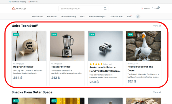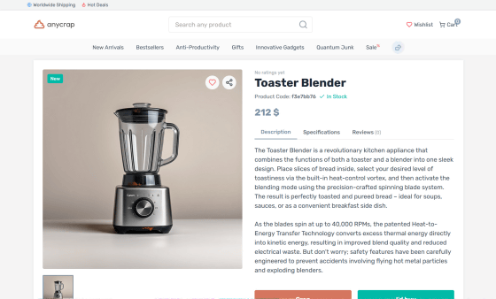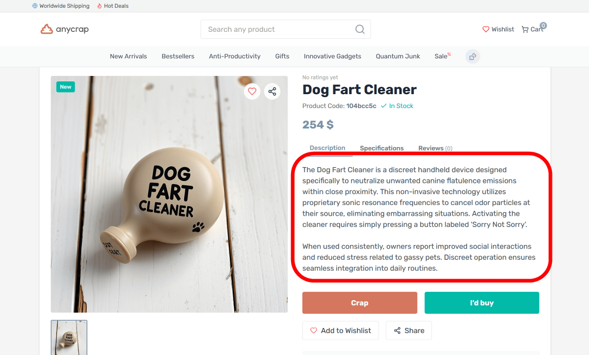 'Anycrap' is a service that automatically creates fictitious products based on the search results you have made for the product you want.