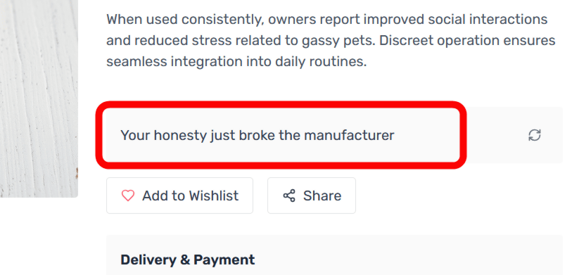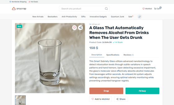 The resulting product was a purchase page for a fictitious product called 'A Glass That Automatically Removes Alcohol From Drinks When the User Gets Drunk.' The description read, 'This smart sobriety glass uses advanced nanotechnology to detect intoxication levels through subtle changes in speech patterns and hand tremors. If excessive intoxication is detected, the glass's molecular sieve effectively absorbs the alcohol molecules in the beverage within seconds. The built-in AI system automatically adjusts settings to provide optimal sobriety monitoring and prevent regrettable hangovers.'