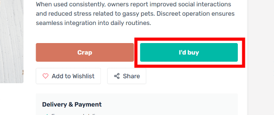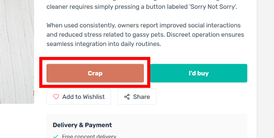 Users can rate each product by clicking 'Crap' or 'I'd buy.' Try clicking 'Crap.'