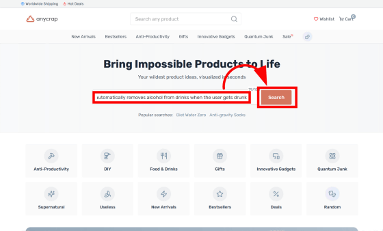 Enter the product you want in the search bar on the top screen and it will create a fictitious product. Try entering 'A glass that automatically removes alcohol from drinks when the user gets drunk' and click 'Search.'
