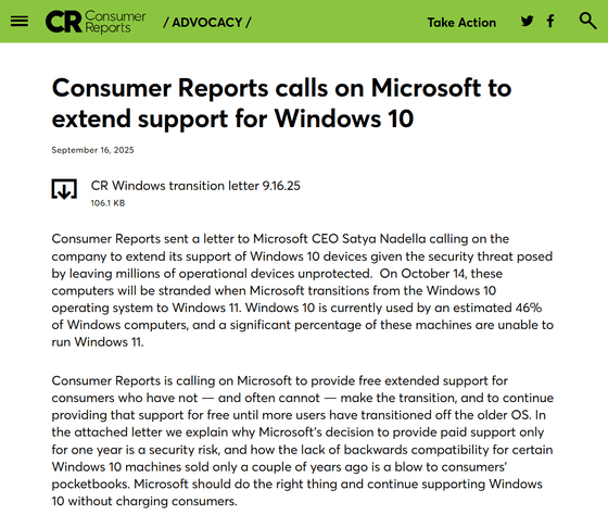 In addition, Consumer Reports criticized Microsoft for charging customers $30 (about 4,400 yen) to extend Windows 10 support for just one year.