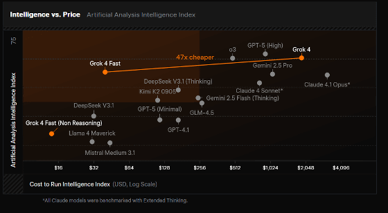 The graph below shows the cost (horizontal axis) and benchmark score (vertical axis) of well-known AI models. Grok 4 Fast achieves comparable performance with Grok 4, but with a score 46 times lower.